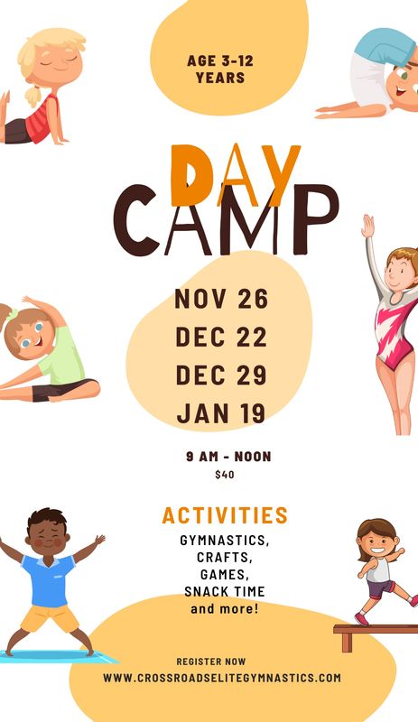 SUMMER CAMP HOURS ARE 9AM TO NOON - MONDAY THROUGH FRIDAY. COST IS $35 PER DAY. PICK AND CHOOSE WHICH DAYS YOU PLAN TO ATTEND. GYMNASTICS, CRAFTS, GAMES AND SNACK! YOU DO NOT HAVE TO BE ENROLLED IN A CLASS TO ATTEND.